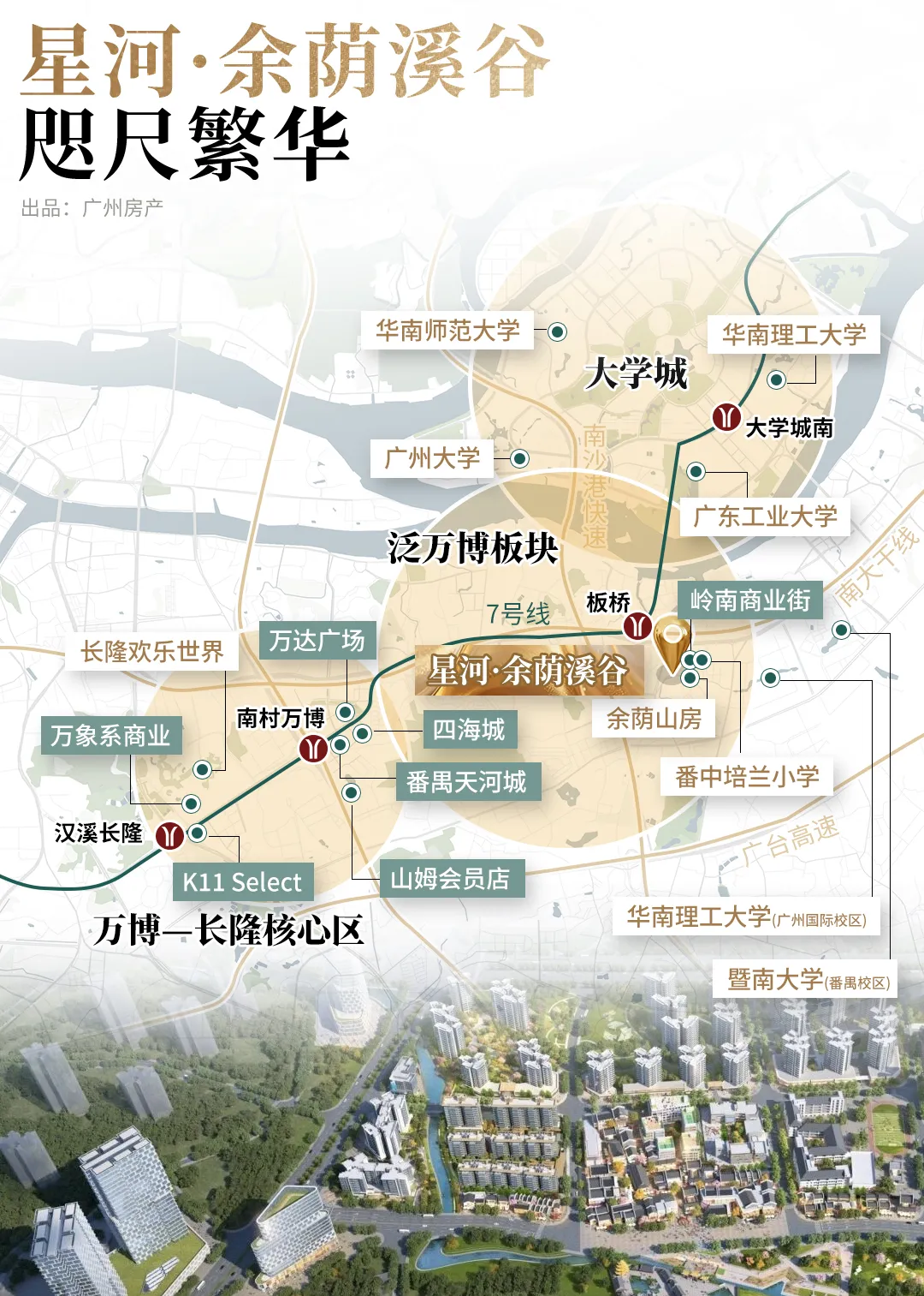 星河余荫溪谷,距离番禺万博仅5公里,两首歌的时间即达CBD核心区,同样实现了“闹中取静,繁华即达”的理想平衡