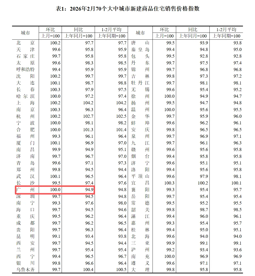 国家统计局发布2026年2月70城房价数据,广州一手房均价环比终于止跌,结束自2025年1月以来长达13个月的下跌态势