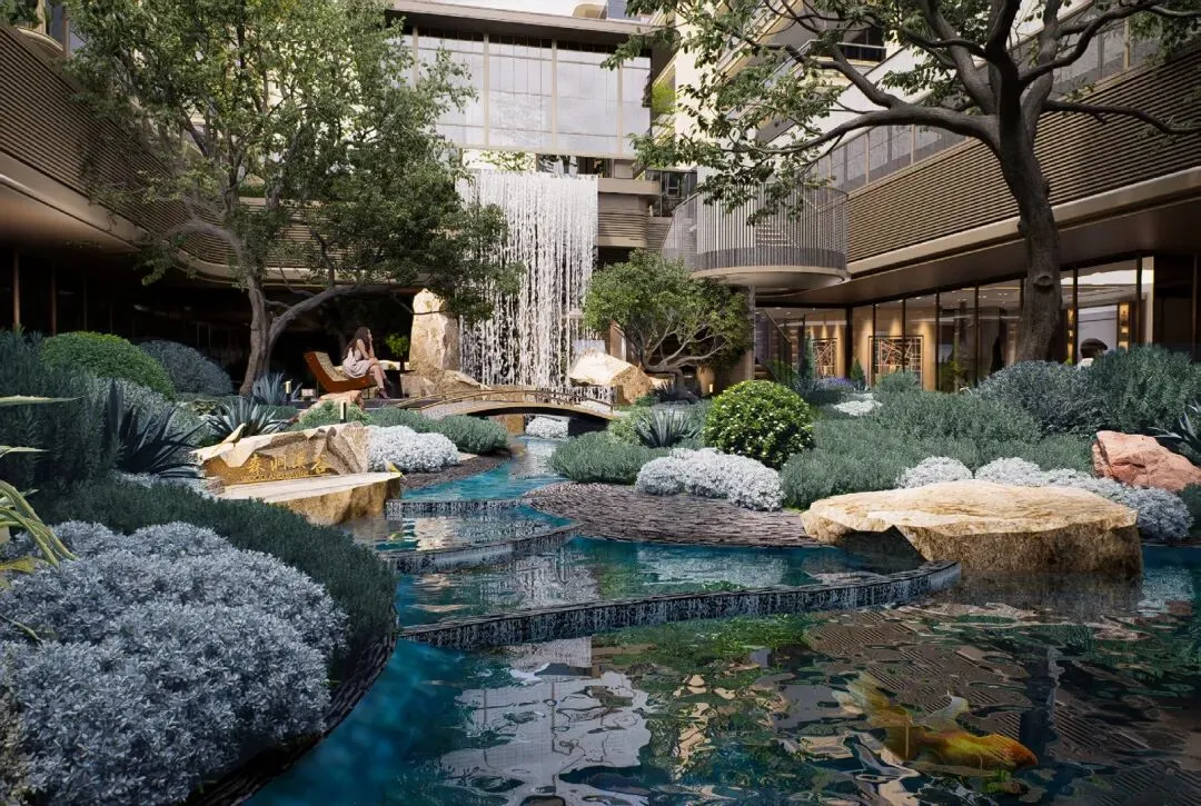 整个庭院以“如意”为形,飞瀑、叠石、流水和绿植错落排布,暗含“承安延年”的风水寓意,让每一步都能邂逅不同景致。