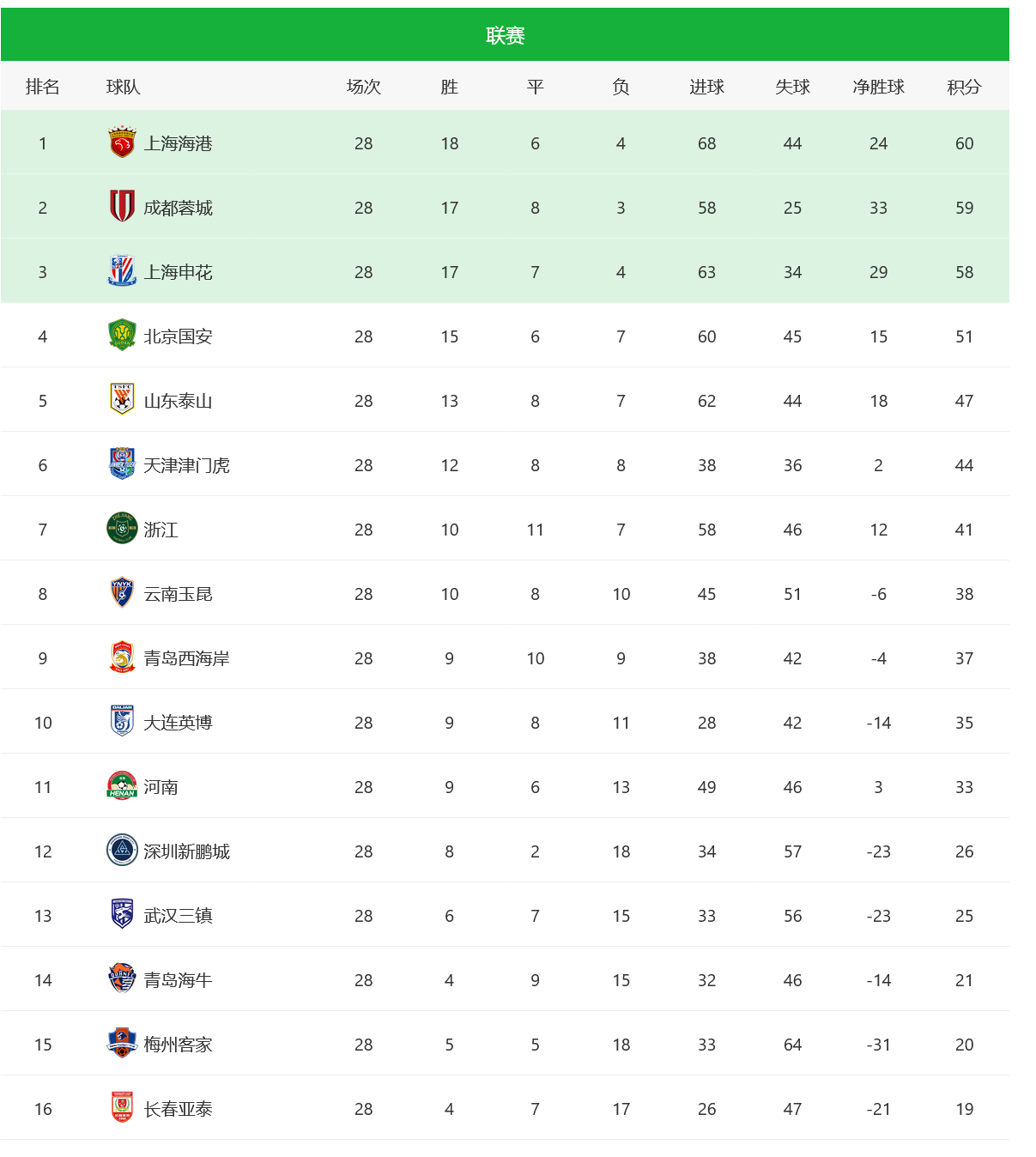 第28轮比赛战罢,三支争冠球队全都不胜,积分榜排名没有发生变化。至此,争冠主动权依然握在上海海港的手里,接下来海港将对阵浙江队、大连英博,两场都拿下即可确保夺冠。