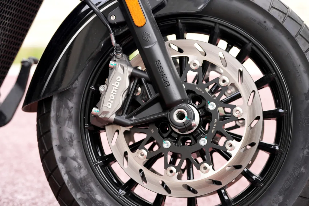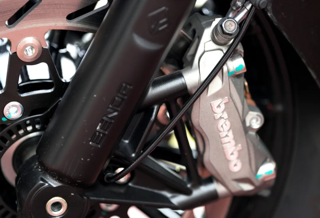 刹车方面,黑旗950配备了Brembo前后刹车系统,其中,前轮为布雷博“水鸟”四活塞对向卡钳+大型双碟;后轮为布雷博“小螃蟹”双活塞单碟。