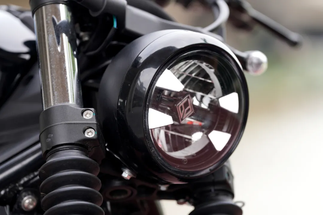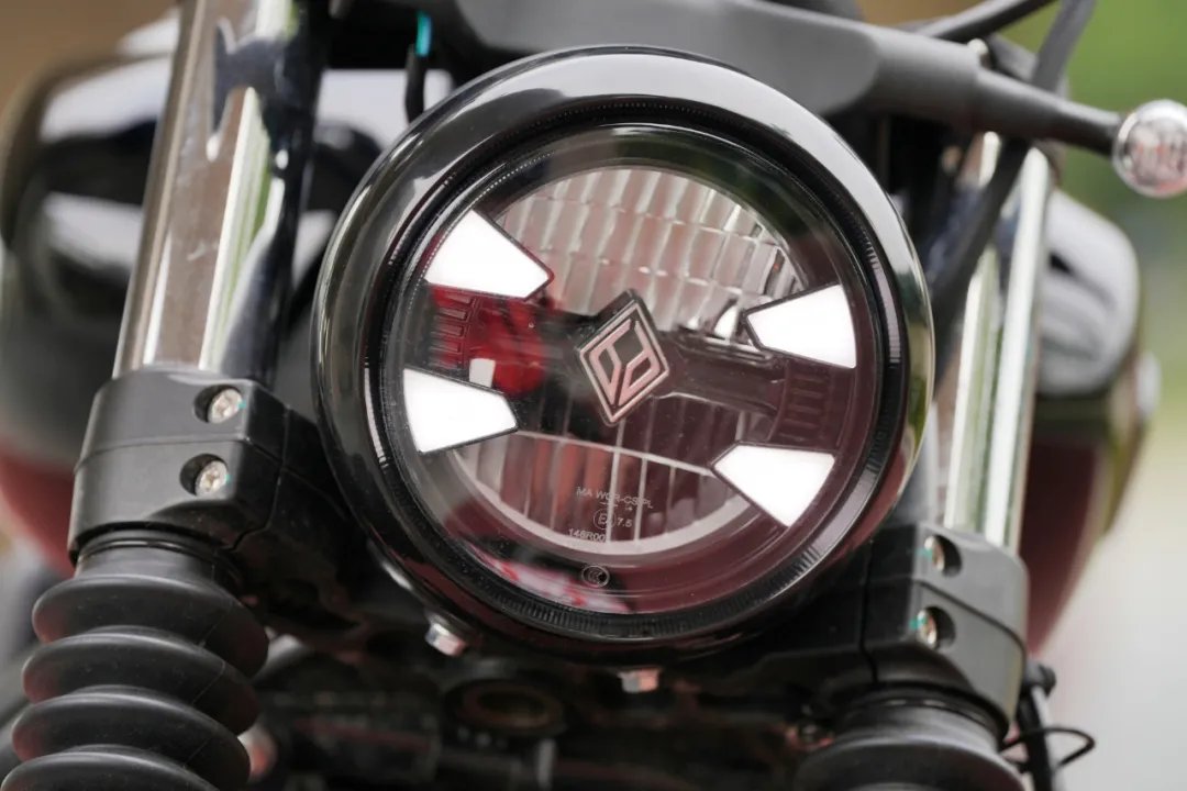从前面看,黑旗950前大灯同样采用了奔达家族式猫牙式LED灯组,但黑旗950专属 4 颗内嵌示宽灯来显示黑旗950独特的V4的动力平台,辨识度非常高。