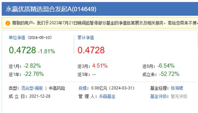 永赢优质精选混合发起A(以下简称“永赢优质精选”)成立于2021年12月,由张海啸担任基金经理,成立至今累计收益为-52.72%,亏损超过一半,累计跑输同期比较基准35个点。