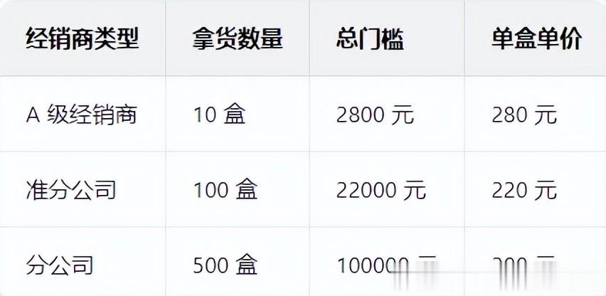 2. **批发利润**:上级经销商给下级供货能赚差价。比如分公司给准分公司供货,分公司拿价200元,准分公司拿价220元,每盒能赚20元;