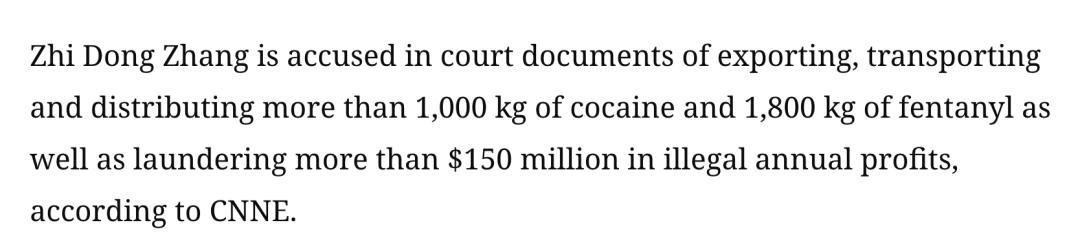 美国当局估计,光是2020 年~ 2021 年,张智栋就往美国贩卖了超过 1800 公斤的芬太尼、1000 公斤的可卡因和 600 公斤的冰毒,获利1.5亿美元。
