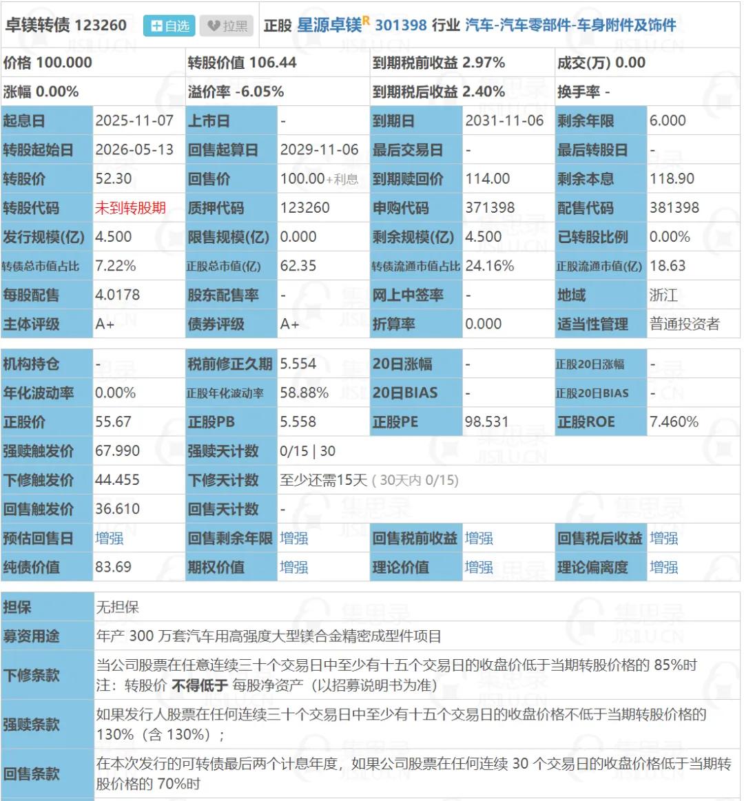卓镁转债:(正股代码:301398,配债代码:381398)