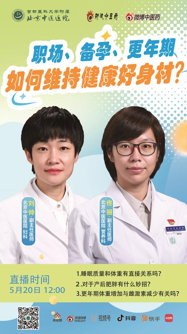 三、聚焦女性健康,线上直播破解减重焦虑女性的体重管理不仅是外在美的追求,更是内在健康的体现,如何能跨越年龄界限,找到适合自己的健康之路,5月20日,临床营养科副主任医师佟丽和妇科副主任医师刘帅,通过多平台开展“女性健康体重管理”主题直播,针对职场、备孕、更年期女性体重管理及女性常见妇科疾病营养治疗等热点问题,结合中西医理论进行深度解读,引起网友广泛关注,大大缓解女性减重焦虑。