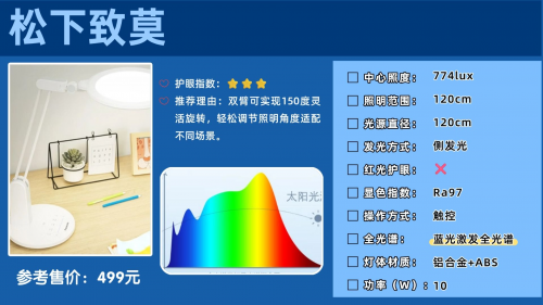 一句话推荐:拥有三分钟“红光”增益,为眼睛输送更多的“营养”;同时拥有OCLT光透镜技术,打造出99.6%还原太阳光的高品质光源,达到护眼更养眼的效果。