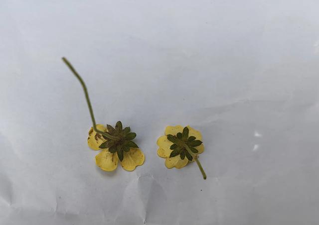 花:单花从叶腋生出,花梗长6-9厘米,有稀疏柔毛;花直径2厘米左右;有萼片5个,副萼片5个,顶端急尖或圆钝(先端不分裂);花瓣5,黄色,宽倒卵形,顶端显著下凹;雄蕊20,雌蕊多数,生于微凸起的花托上。