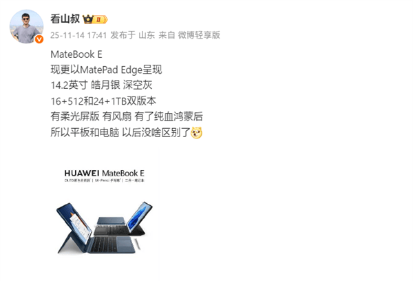 根据数码博主@数码闲聊站的爆料,这款二合一平板配置相当能打:14.2英寸OLED屏,还有柔光屏版本可选,搭载麒麟9系平台,直接打通鸿蒙生态。