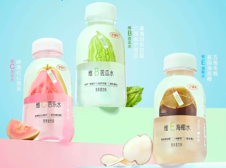 果蔬女团水系列功能饮料,包括维C芭乐水、维B苦瓜水和维E海椰水。其中,维C芭乐水选用岭南红心芭乐,搭配长白山椴树蜜和柠檬,口感酸甜回甘,具有丰富的维生素C;维B苦瓜水选用广西南宁油苦瓜,搭配青海羽衣甘蓝和长白山椴树蜜,微苦回甘;维E海椰水搭配泰国海底椰和五指毛桃,椰香浓郁,清新自然,具有丰富的电解质。