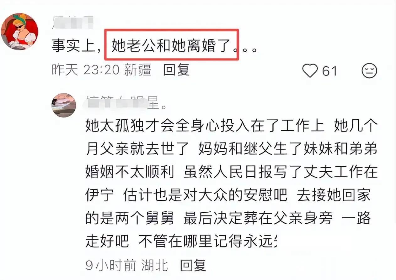 现在网上还有人在讨论她的婚姻,讨论她的意外细节。说实话,挺没劲的。