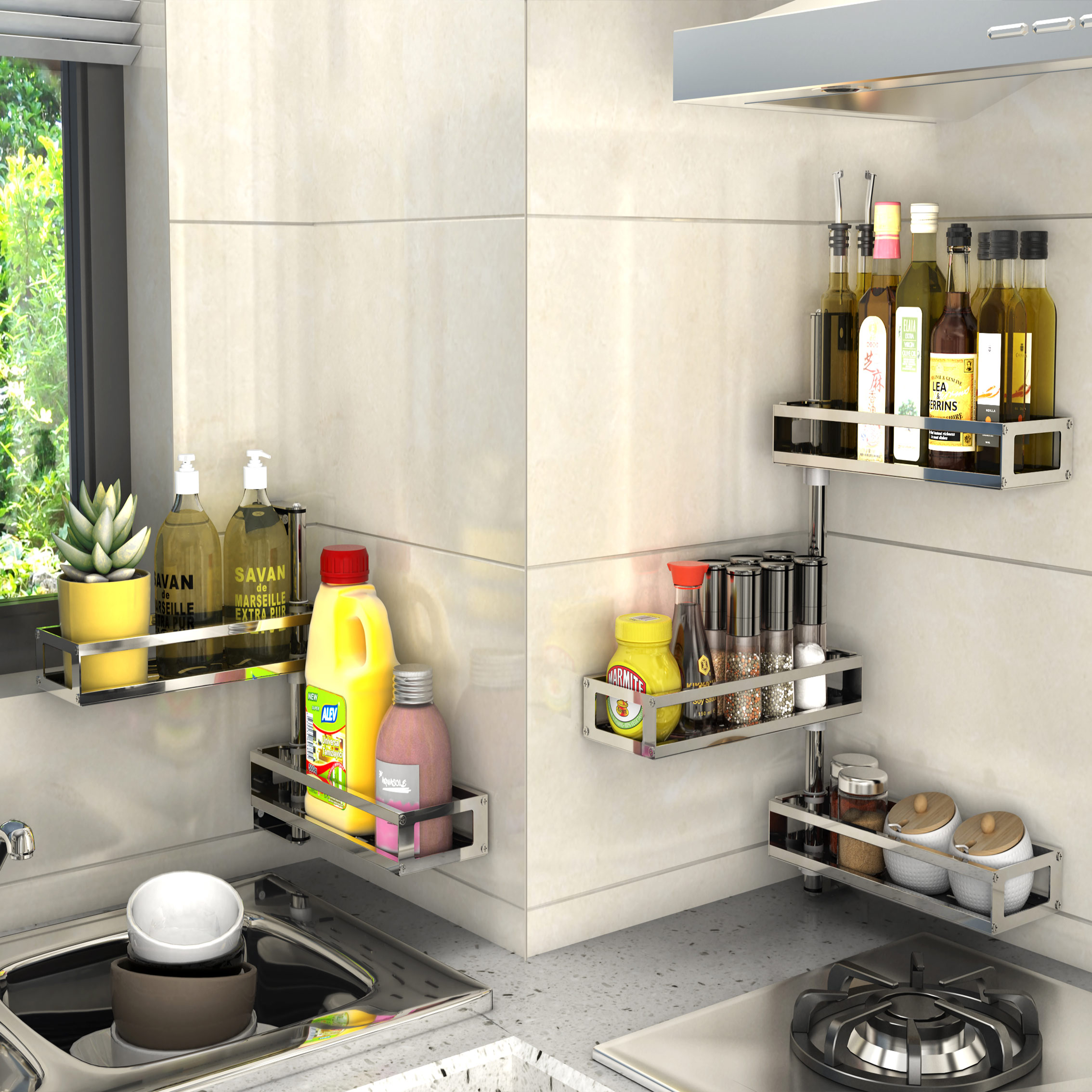 如果厨房的角落的空间利用起来,装上一些收纳架,不就可以增大墙面的收纳空间了吗?而且也有很多免打孔的置物架哦,性价比也高,如果有需要的可以参考一下哦!