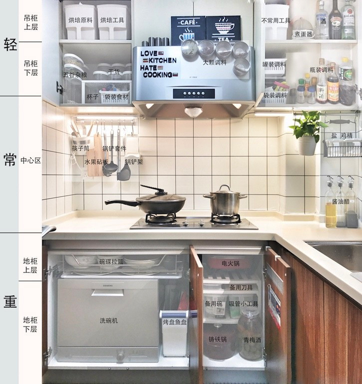 一般来说橱柜的设计都是按照一般物品摆放顺序,也就是物品的重量和体积等来规划的,一个好的设计师对于橱柜的设计肯定是按照一个家庭的需求来合理安排,比如大件物品肯定是在柜子的最低,而一般操作台就是日常使用的,顶柜的设计主要是为了放平时很少用的家具。