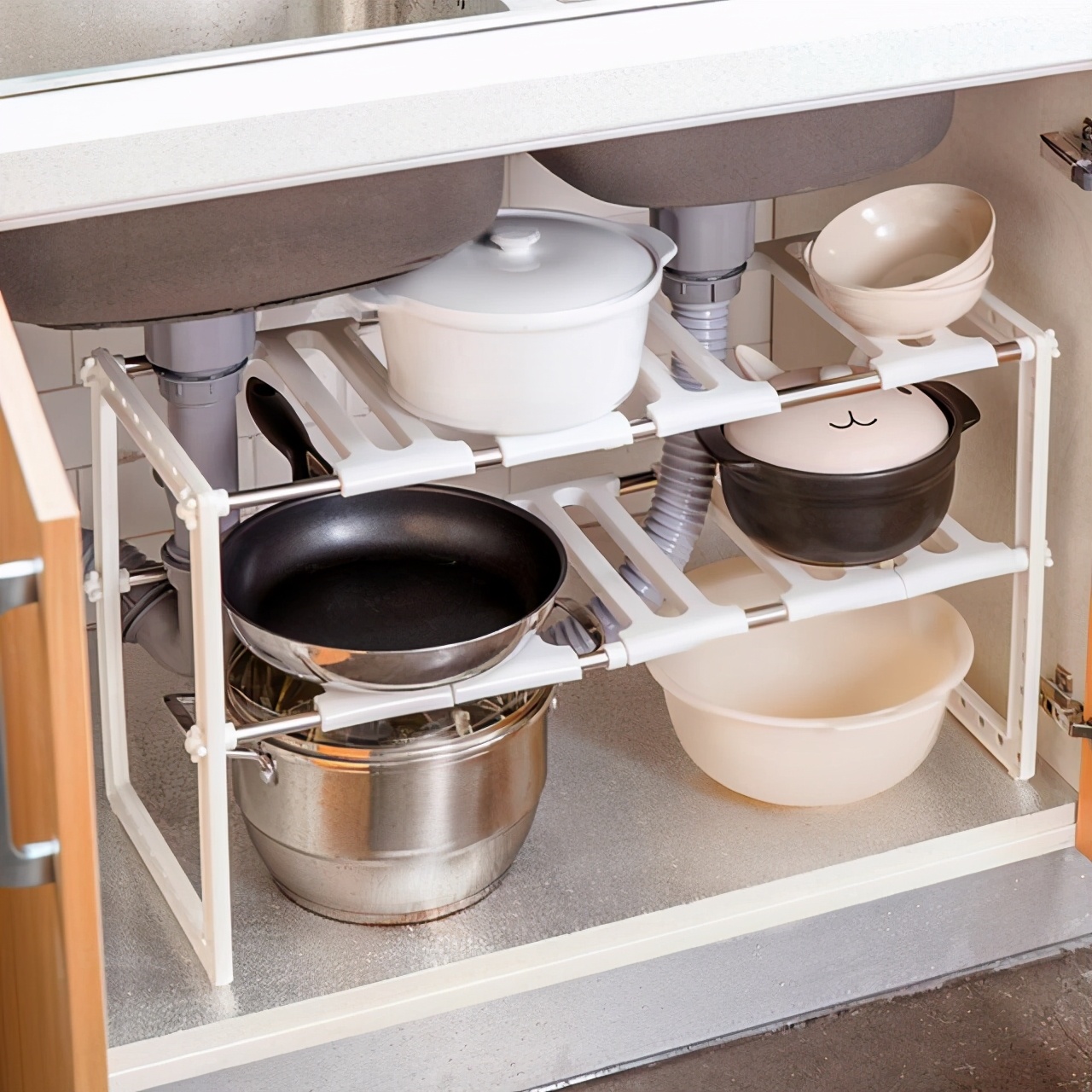 充分利用水槽下方的收纳空间,很多家庭的厨房并没有重视到水槽下方的空间,其实只要放置一个组装的收纳架,就可以了,你们觉得呢?