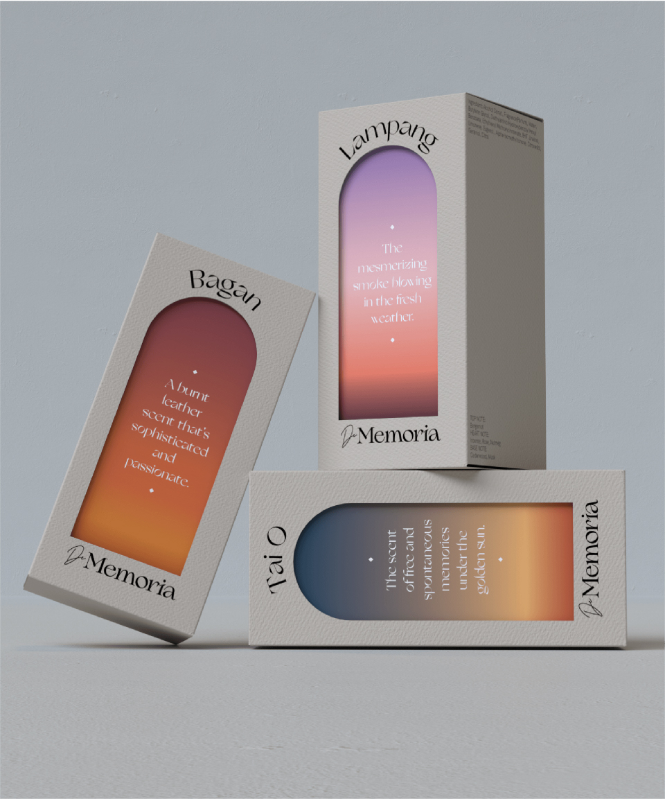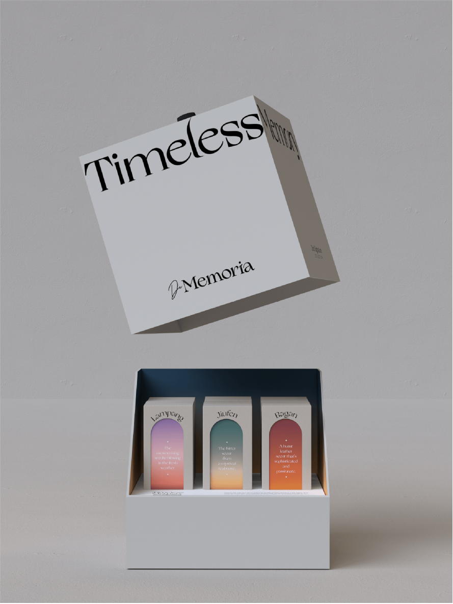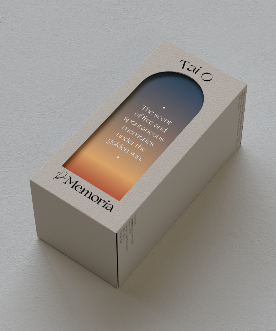 DeMemoria的包装宛如一首无声的诗意乐章。其以渐变的色彩来模拟天空的变幻,从温暖橙黄到深邃蓝黑,仿佛将日出日落的绝美瞬间凝固在包装之上。拱形的窗口设计独具匠心,像是打开了一扇通往美好意境的窗户,透过它,能让人联想到蕴含的独特香气和情感记忆。瓶身与包装盒的线条简洁流畅,黑色的瓶盖增添了一份沉稳与高雅。文字排版优雅大方,与整体风格完美融合,每一个细节都透露着对品质和美学的极致追求。这样的包装,像是一个承载着故事和情感的容器,让人在拿到包装的那一刻,就沉浸在它所营造的独特氛围之中。