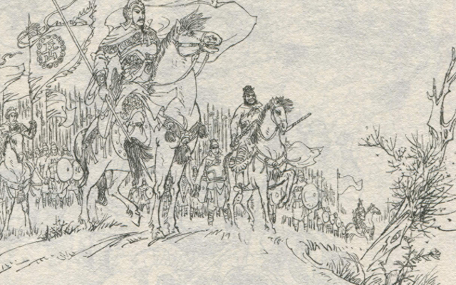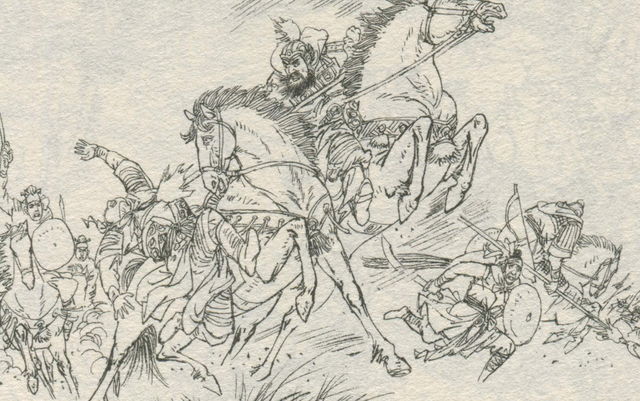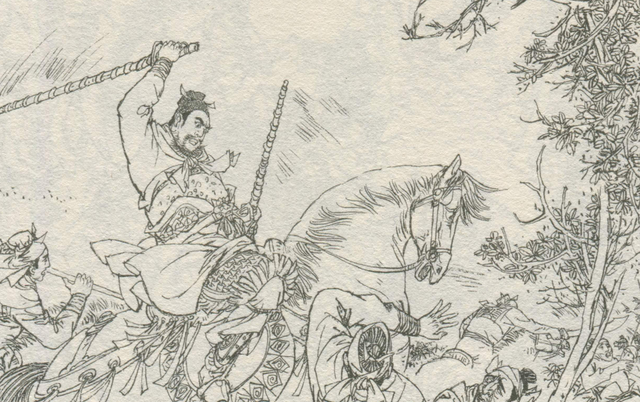 吴锡怒马突出,左手持刀,右手执盾,飞上山冈,部下见主将奋不顾身前进,也拼命随上。