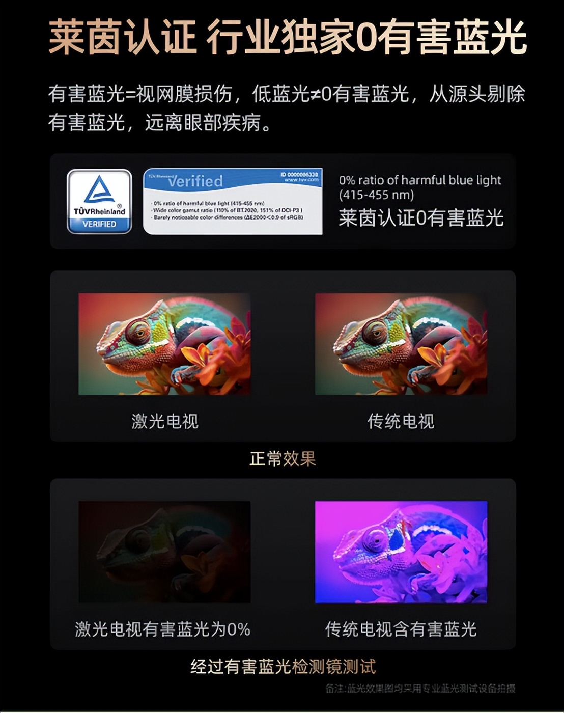 其次,激光电视的成像原理和发光特性,可以从源头屏蔽对人眼有伤害的短波蓝光波段,避免蓝光伤眼的问题,更好的保护眼睛。此外它采用的反射式成像原理,光线柔和,也能有效减少长时间观看引起的视觉疲劳。