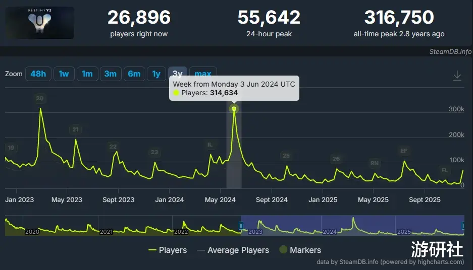 而更残酷的是,哪怕站在“赢家”行列里,也未必能一直笑下去。索尼旗下的Bungie,打造了几乎堪称欧美3A游戏工业的GaaS化标杆的《命运2》,但其年八更新“预言之年”却成了系列最低谷,迎来了系列历史上最剧烈的断崖式下滑。