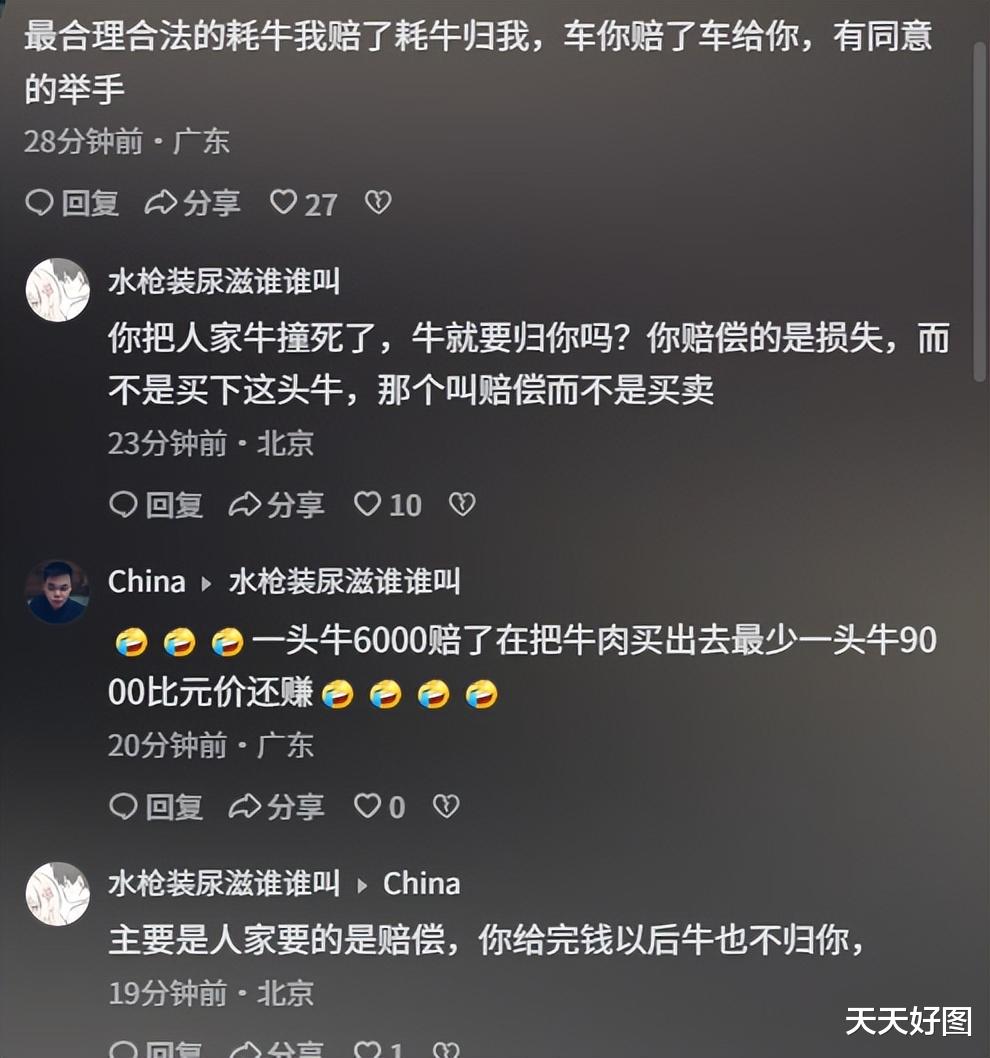 有网友给算了一笔账,若保险赔付按市价足额覆盖死亡及重伤牦牛损失,可基本弥补牧民的主要经济损失,这些牛肉处理一般能2000元左右,合计一头牛最终能赔9000元左右。大众争议点主要是:“司机赔付完了,这些牦牛肉归属谁”。是不是如网友所说:“牦牛命买一次,然后肉再卖一次”。
