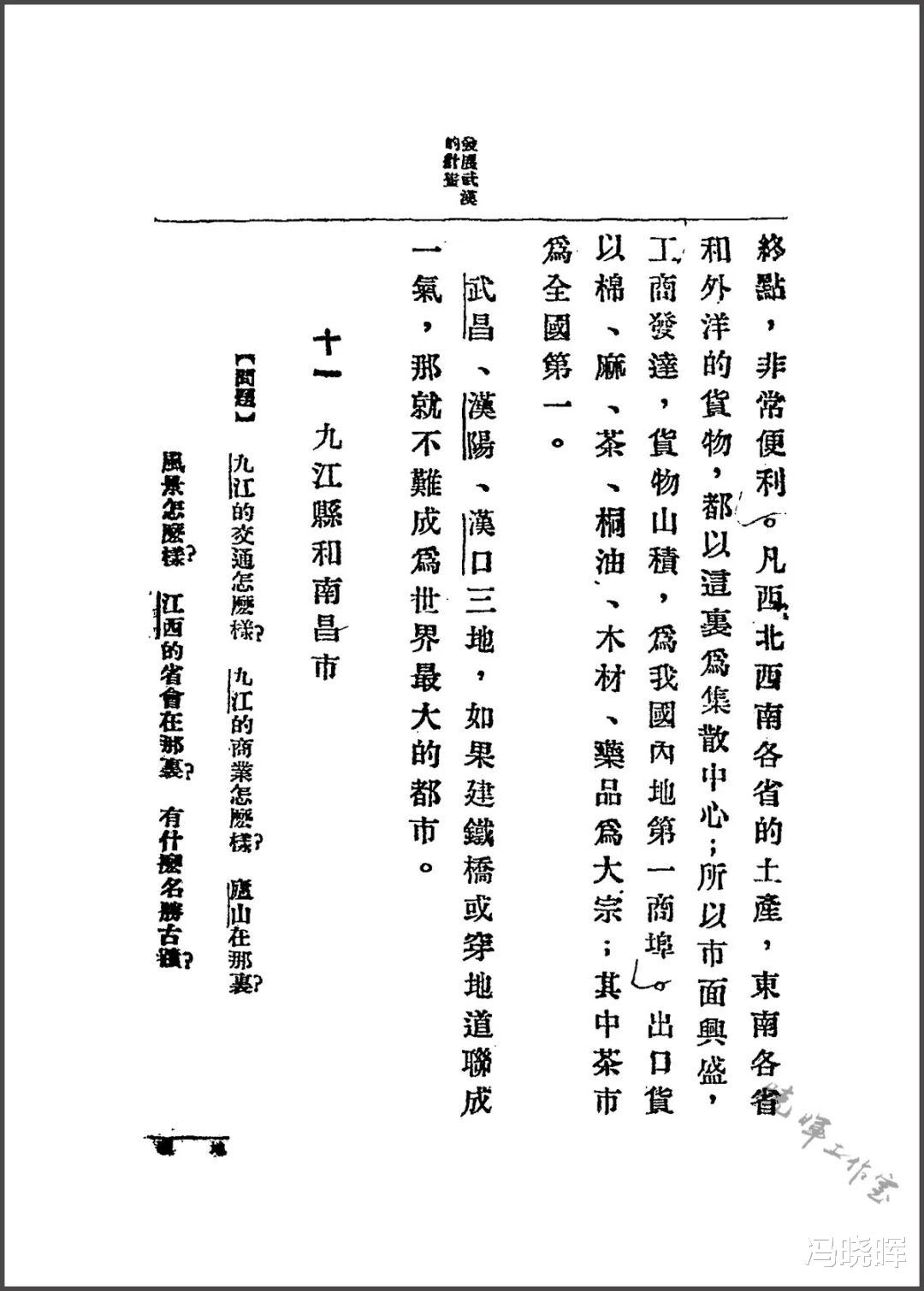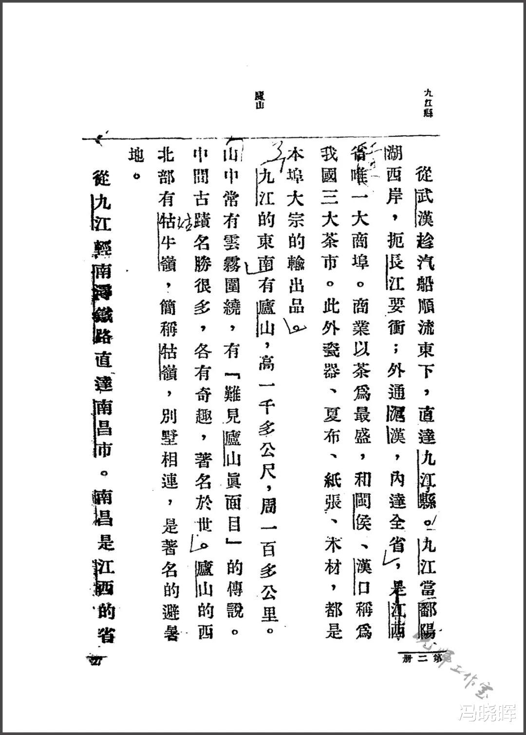 从武汉趁汽船顺流东下,直达九江县*。九江当鄱阳湖西岸,扼长江要冲;外通武汉,内达全省,是江西省唯一大商埠。商业以茶为最盛,和闽侯、汉口称为我国三大茶市。此外瓷器、夏布、纸张、木材,都是本埠大宗的输出品。