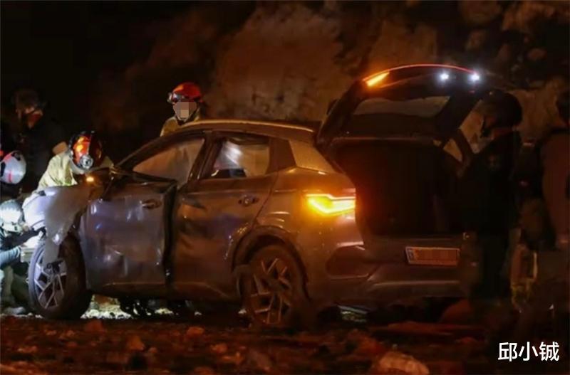 这辆遭遇导弹爆炸的SUV是比亚迪ATTO 3,这是海外版车型的名字,其实就是我们国内市场的元PLUS。从事故现场图片能够看到,这辆比亚迪就停在弹坑旁边,受到爆炸强烈冲击到车窗玻璃全部破碎,气囊弹出,车身布满弹片痕迹,但是关键性的ABC柱没有明显形变,车门可以打开,电池包未起火、未漏液,甚至还打着双闪灯证明电力系统依然保持工作。据悉当时车内满员,驾乘者均无生命危险,遭遇导弹爆炸后自行撤离就医。