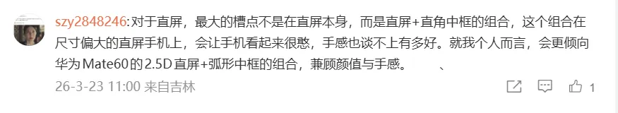 "对于直屏,最大的槽点不是在直屏本身,而是直屏+直角中框的组合,这个组合在尺寸偏大的直屏手机上,会让手机看起来很憨,手感也谈不上有多好。就我个人而言,会更倾向华为Mate60的2.5D直屏+弧形中框的组合,兼顾颜值与手感。"