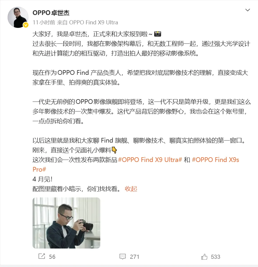 卓世杰也不含糊,上任第一天就直接送见面礼,爆料了一个重磅消息:"这次我们会一次性发布两款新品——OPPO Find X9 Ultra和OPPO Find X9s Pro,4月见!"还不忘皮一下:"配图里藏着小暗示,你们找找看。"