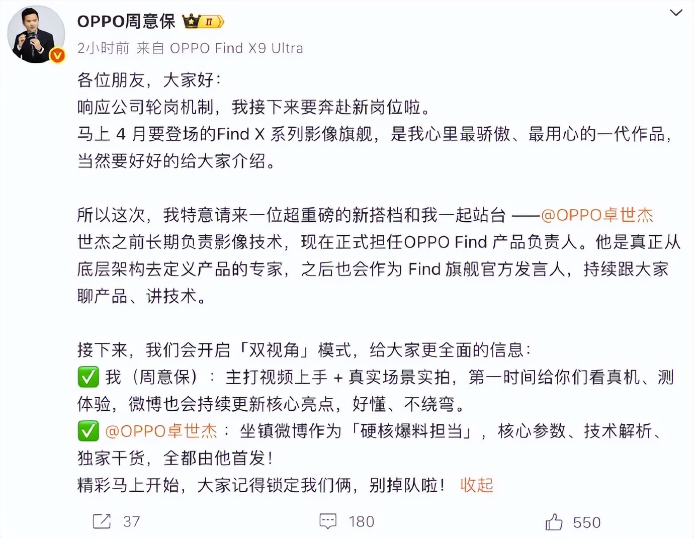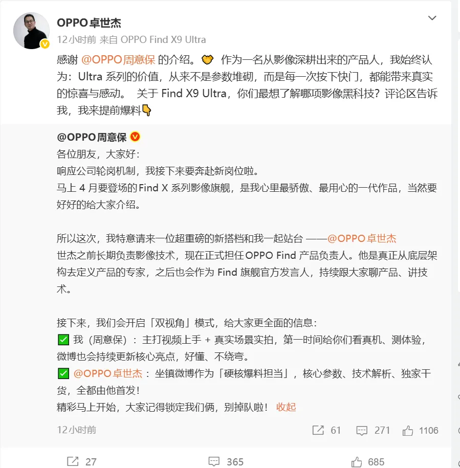 另外周意保还官宣了自己的接棒者——原OPPO影像开发部长卓世杰。这波交接玩得溜啊!周意保在博文中特意强调,以后他和卓世杰将组成"双视角"CP:周意保负责"视频上手+真实场景实拍",卓世杰则是"硬核爆料担当",专门负责核心参数等技术内容。