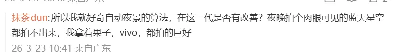 "所以我就好奇自动夜景的算法,在这一代是否有改善?夜晚拍个肉眼可见的蓝天星空都拍不出来,我拿着果子、vivo,都拍的巨好。"