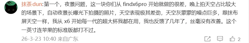 "第一个,夜景问题,这一块你们从Find X6 Pro开始就做的很差,晚上拍天空占比较大的场景下,自动夜景长曝光下拍摄的照片,天空表现极其差劲,天空灰蒙蒙的噪点巨多,跟抹布屏天空一样,我从X6开始每一代的超大杯我都在用,我也反馈了几年了,丝毫没有改善。这个一英寸连苹果的标准版都打不过。"