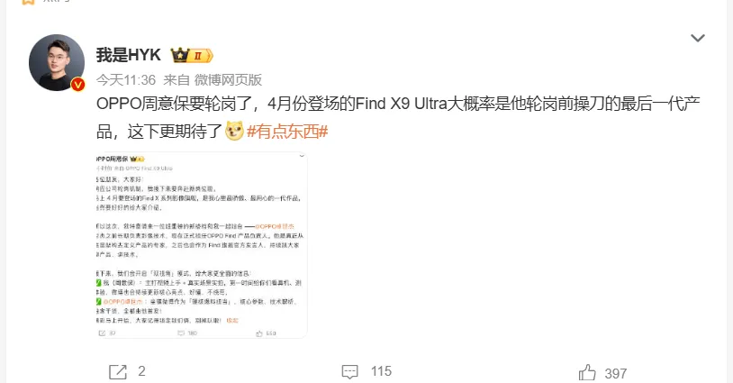 事情是这样的,3月23日,OPPO副总裁、Find系列产品负责人周意保突然在微博上发了一条"告别信"。他在文中表示,因为公司轮岗机制,自己将奔赴新的岗位,而他负责的4月份即将登场的"Find X系列影像旗舰",成了他卸任前的最后杰作。