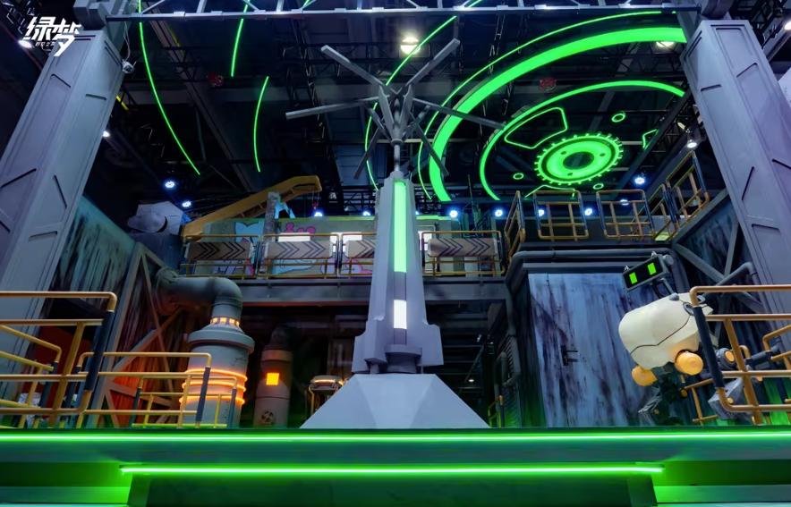 本届萤火虫漫展,《绿梦:时空之声》为观众带来现场最具末日科幻美感的置景,展台以展现后灾难时代的人类文明为核心设计理念,造型融合工业朋克与废土美学,呈现出极具辨识度的视觉风格——半空中呼啸而过的有轨电车,复古的机械框架结构,搭配锈蚀钢板、管道齿轮与发光线路,营造出末世都市中顽强运行的工业基地氛围。展台整体布景层次丰富,将“废墟中的希望”这一概念具象化,为玩家构建出真实可感的游戏世界入口。