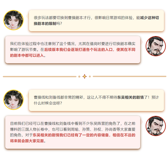 当然,玩法上美术上展现出的游戏品质是一方面,策划的“听劝”也是玩家喜欢它的很大一部分原因,这点参与过《三国望神州》前几轮内测的玩家一定知道,对于玩家的建议《三国望神州》策划们向来是光速回应并且实装的,即使在公测后一个多月也仍是如此,前段时间,官方还专门为玩家出了一则策划答疑,对玩家的建议做了一一回应。