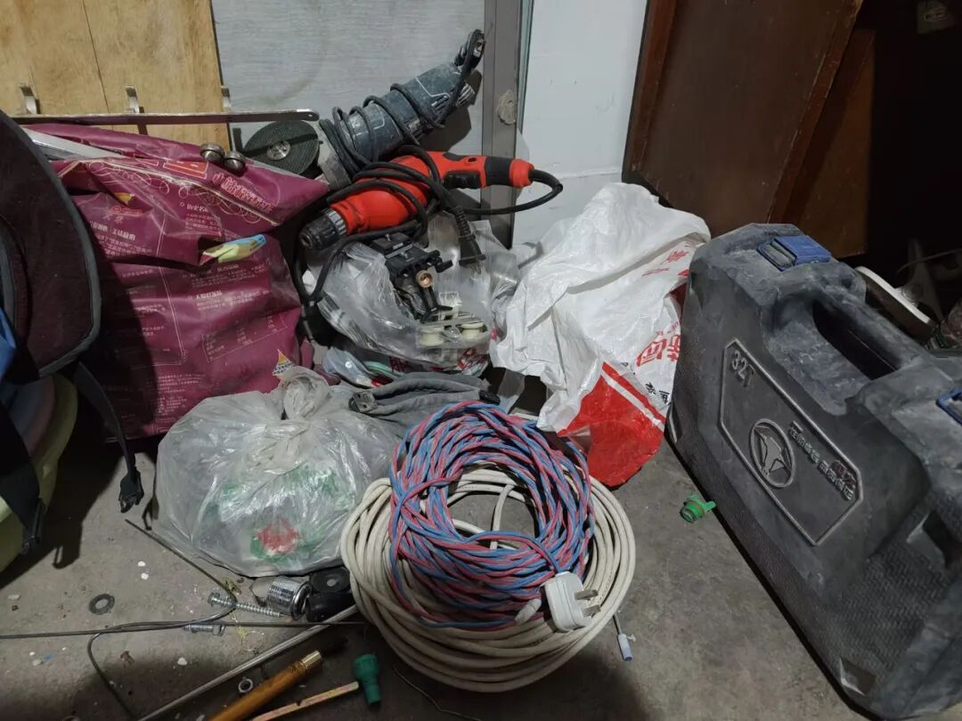 地上更乱,立白洗衣粉袋靠在墙角,空油桶、油漆桶滚在一边,红黑相间的电锤、盘成圈的电线、角磨机被随意堆在墙根,这些家什七零八落的,却也明明白白地告诉人,表叔是个手艺人,水电、装修、安装的活计,他样样都能接。