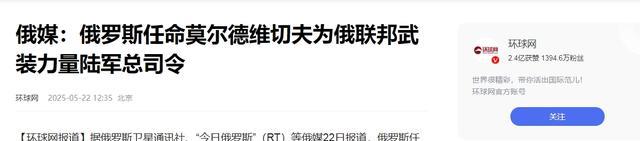 1、环球网《俄媒:俄罗斯任命莫尔德维切夫为俄联邦武装力量陆军总司令》