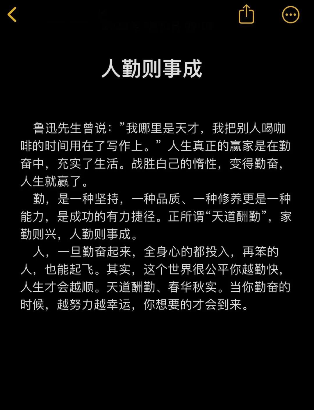 有人说,人生像一场马拉松,只有坚持不懈的努力,才能跑到终点。勤奋,是成功的基石。你可以没有天赋,但只要持之以恒,总能迎来曙光。正如那些普通人通过不懈努力,成为行业的佼佼者;他们用汗水和坚持,证明了“勤奋”的力量。这种精神激励着无数人:只要不放弃,梦想终会照进现实。