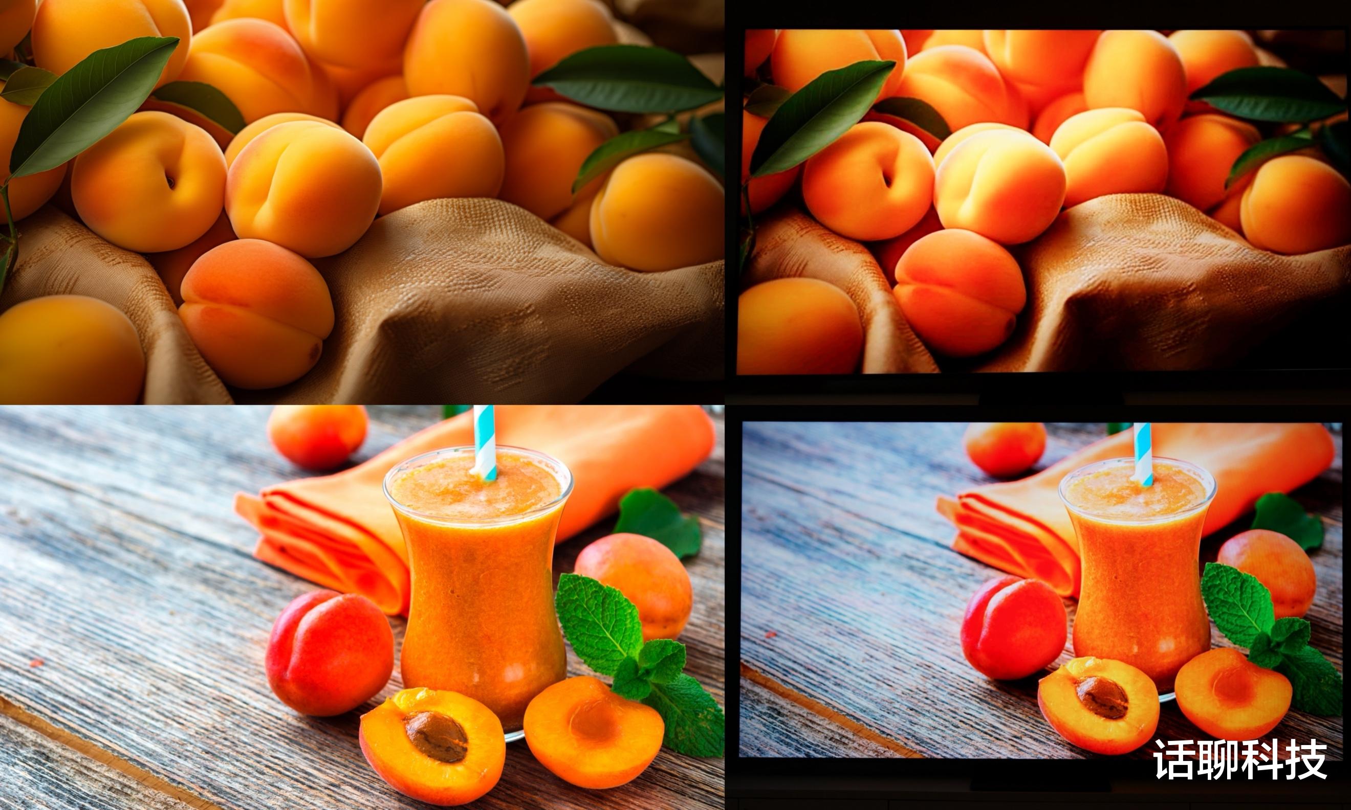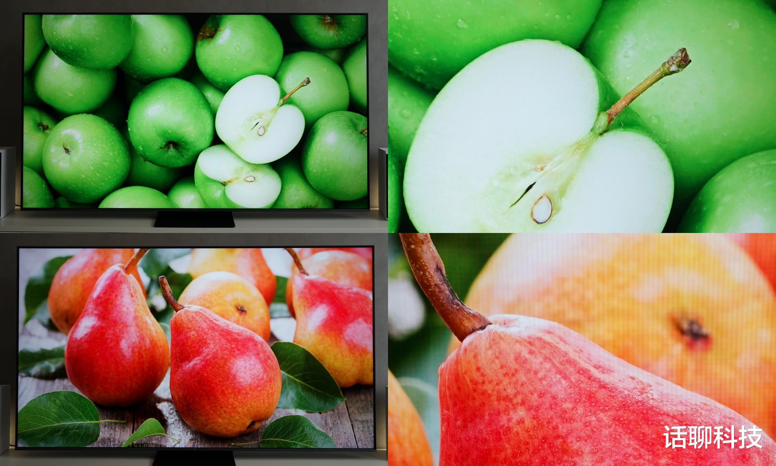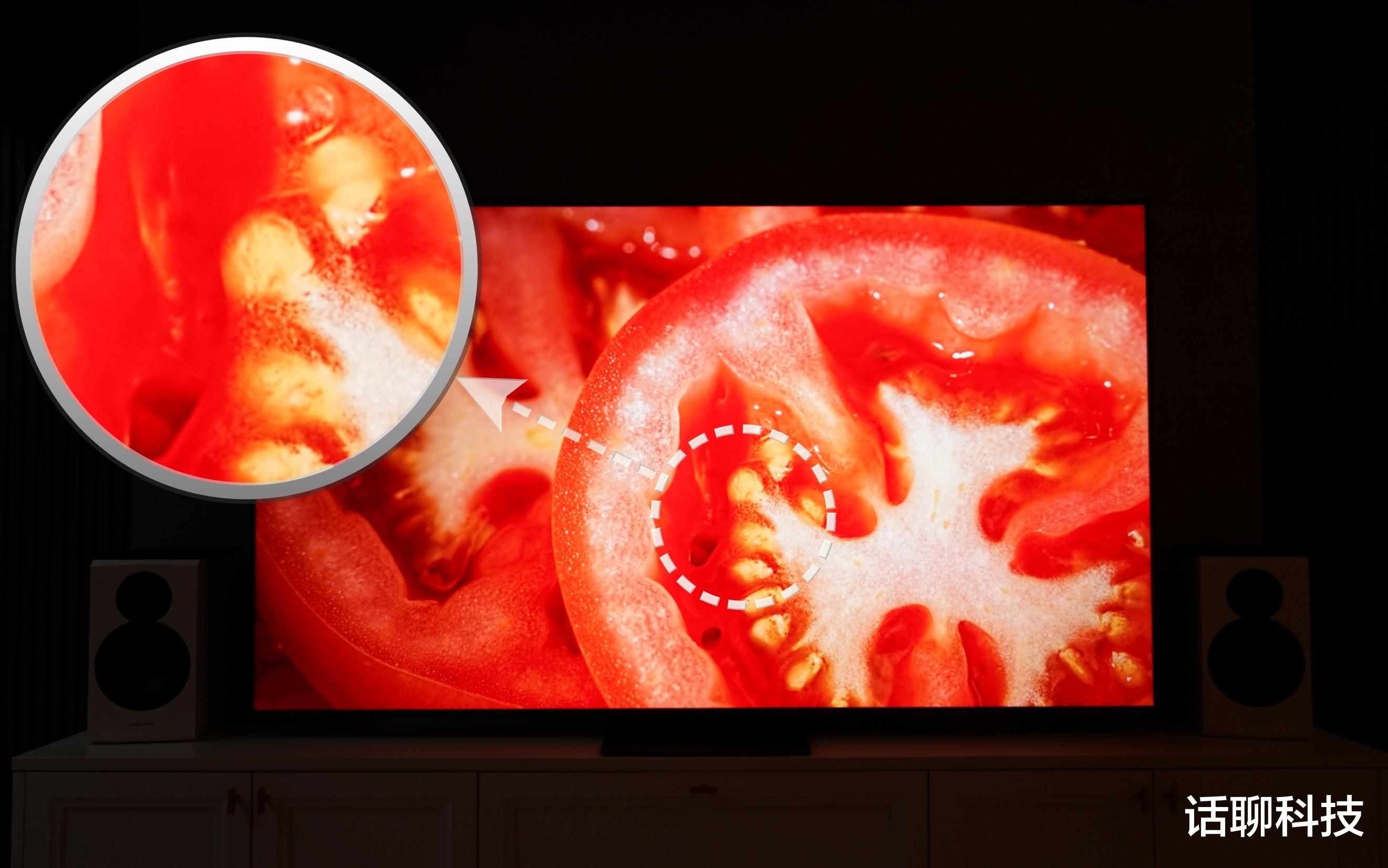 再比如显示西红柿的画面,成熟的西红柿籽是饱满的金黄色,在红色的背景中也没被侵染。并且极少数的没有受粉长成籽而变深褐色的扁籽也能很自然的车更新鲜。至于发白的沙瓤,也是细看似乎还能看到颗颗粒粒分离的感觉。