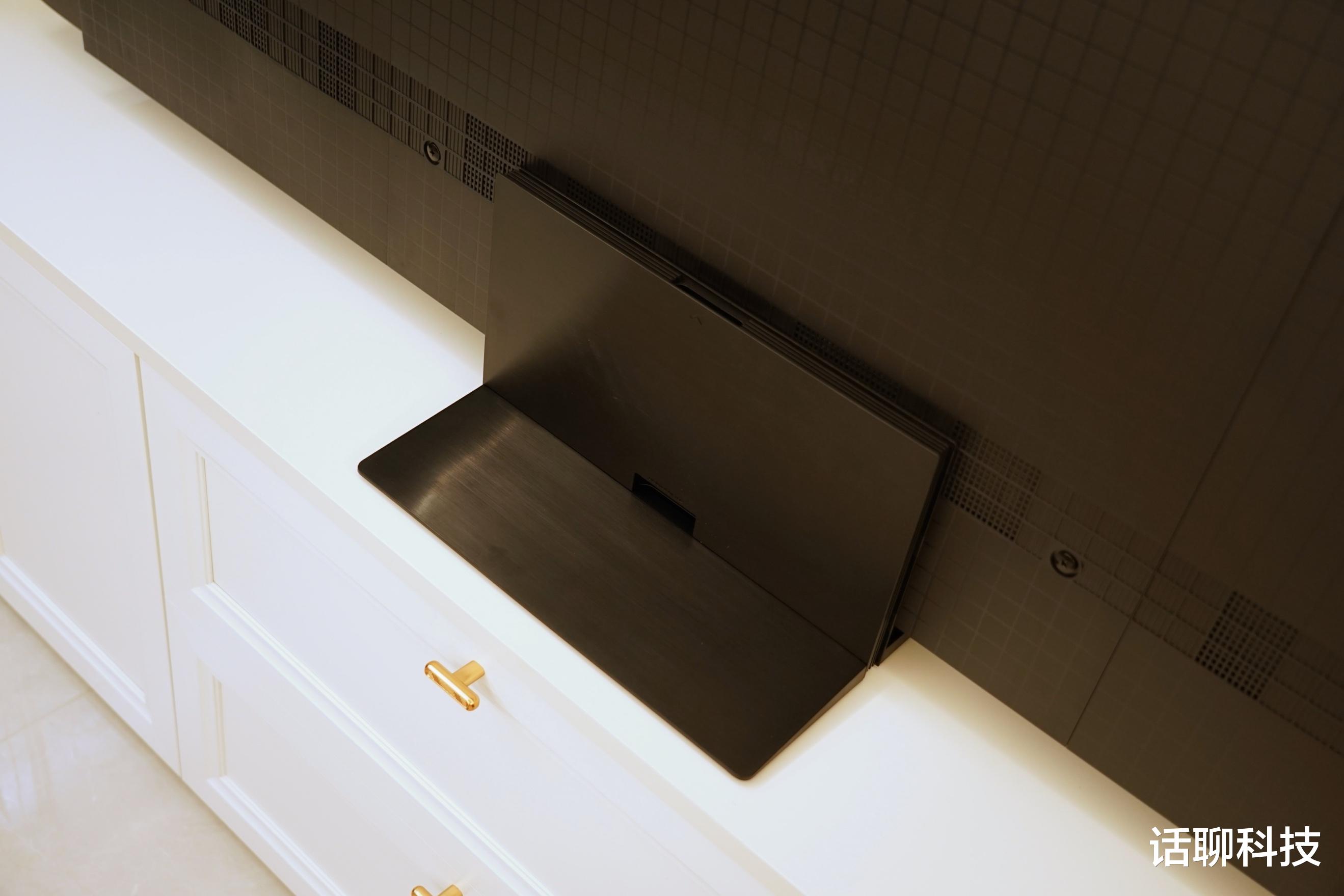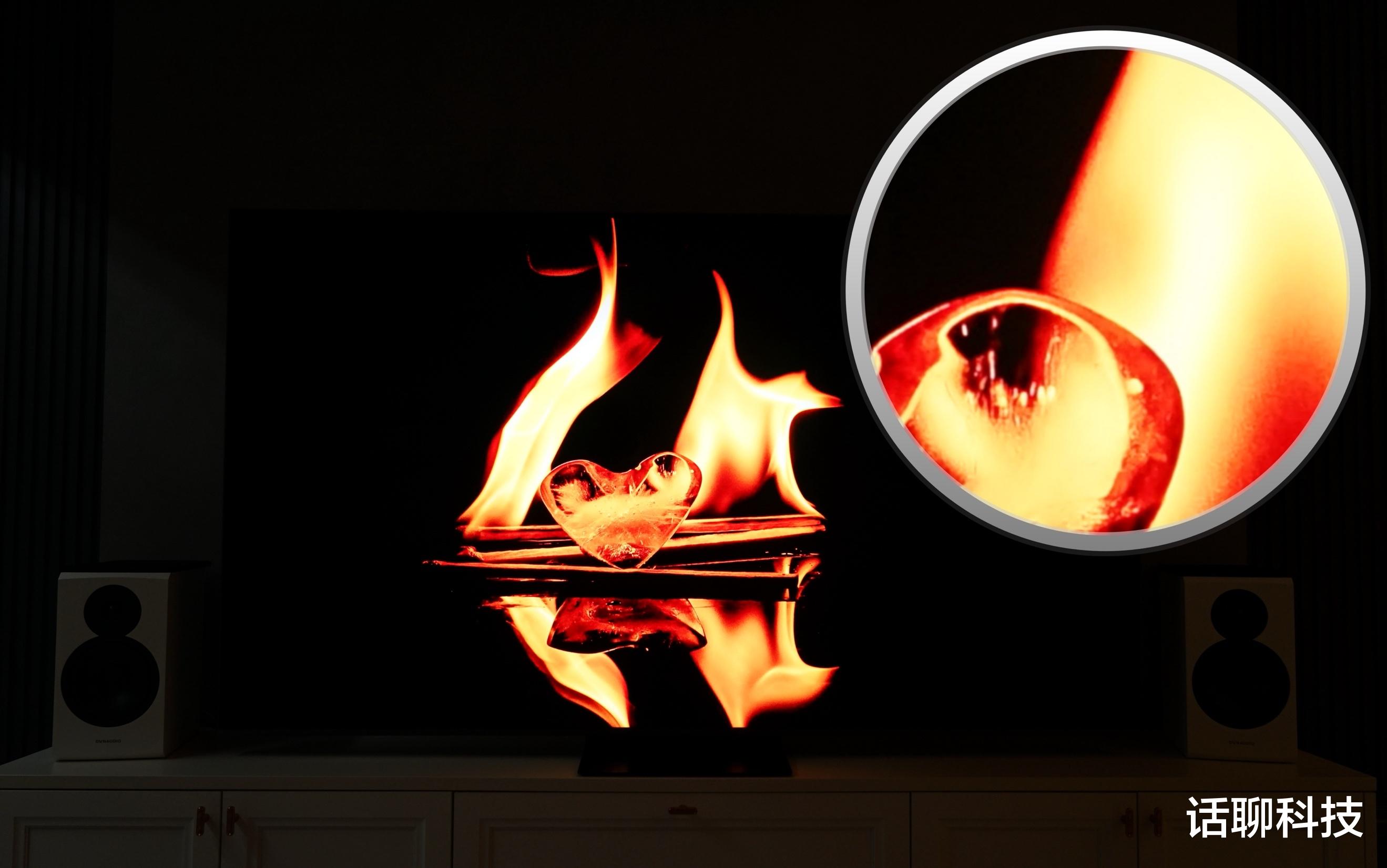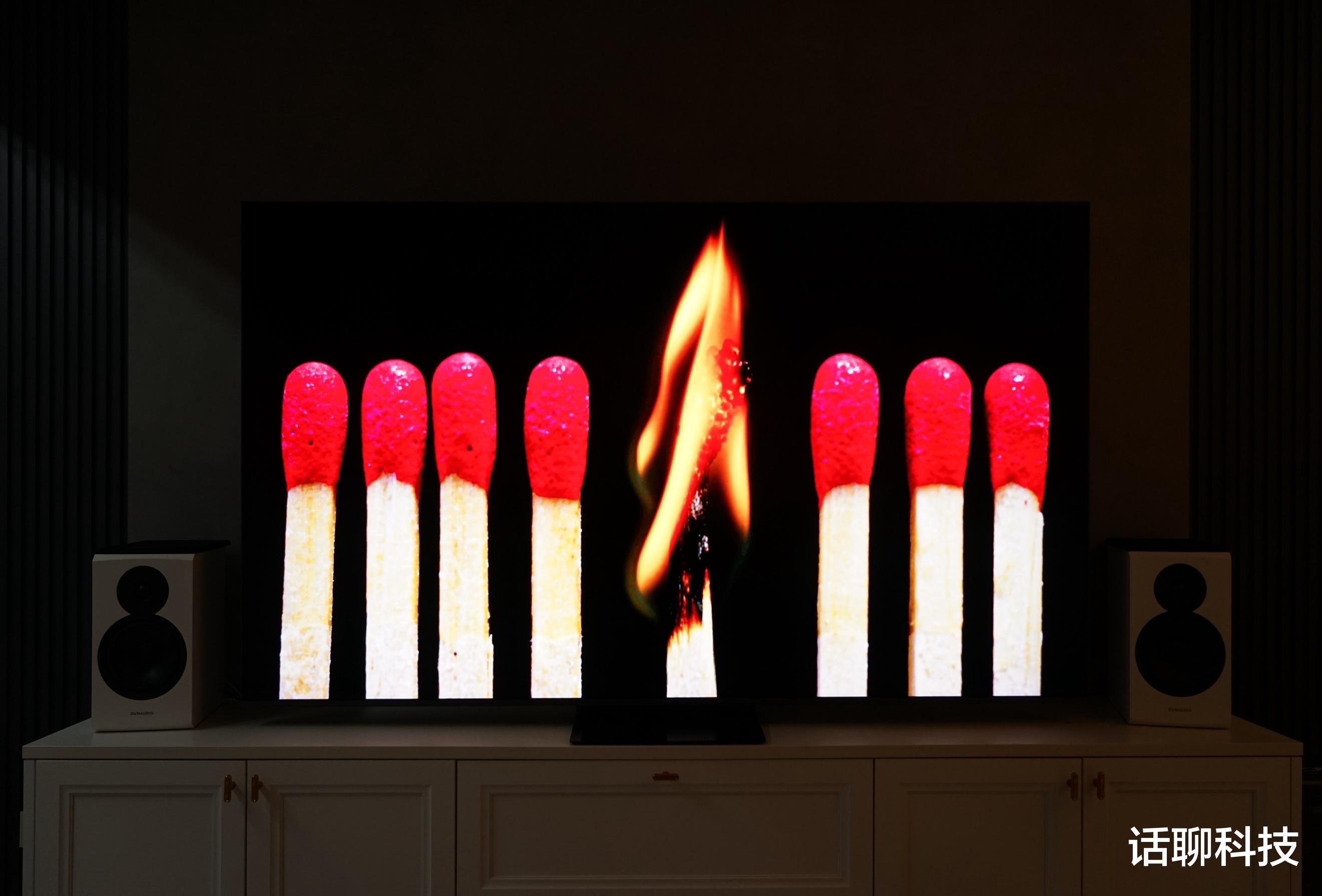 在较暗的环境下使用,电视显示黑色背景画面,比完全不发光的黑灰色岩板电视墙呈现的色彩还要更黑,完全看不到传统LCD电视的屏幕漏光、黑色泛蓝现象,点燃的火柴就像是真的在火焰一般飘在黑色的空间中。