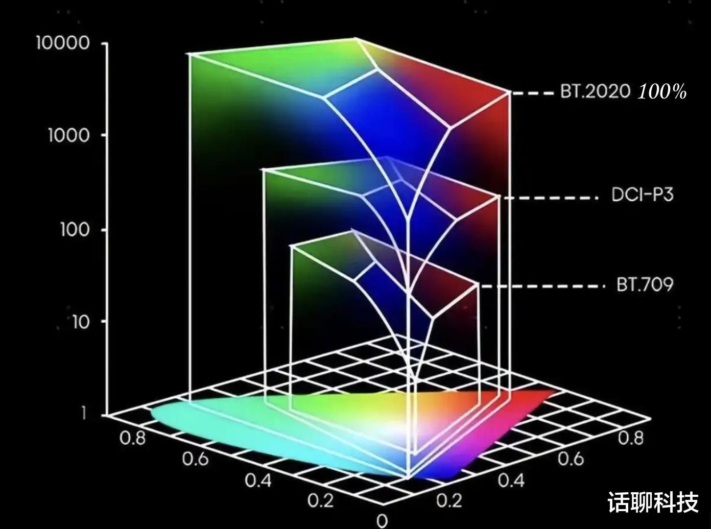 85英寸的TCL Q9M Pro拥有2952个万象分区、XDR 5000nit峰值亮度,支持100%BT.2020全局高色域,与同价位产品相比,SQD-MiniLED的技术优势也很明显。怎么理解这几个参数呢?用下图的色彩空间来分析,100%BT.2020的色域覆盖就相当于把底面积做到了最大,亮度XDR 5000nit相当于把高度做高了,而基于万象分区实现的局部精细控光带来的超高对比度,实际上就相当于在这个色彩空间中任何一个点位的色彩都能呈现。