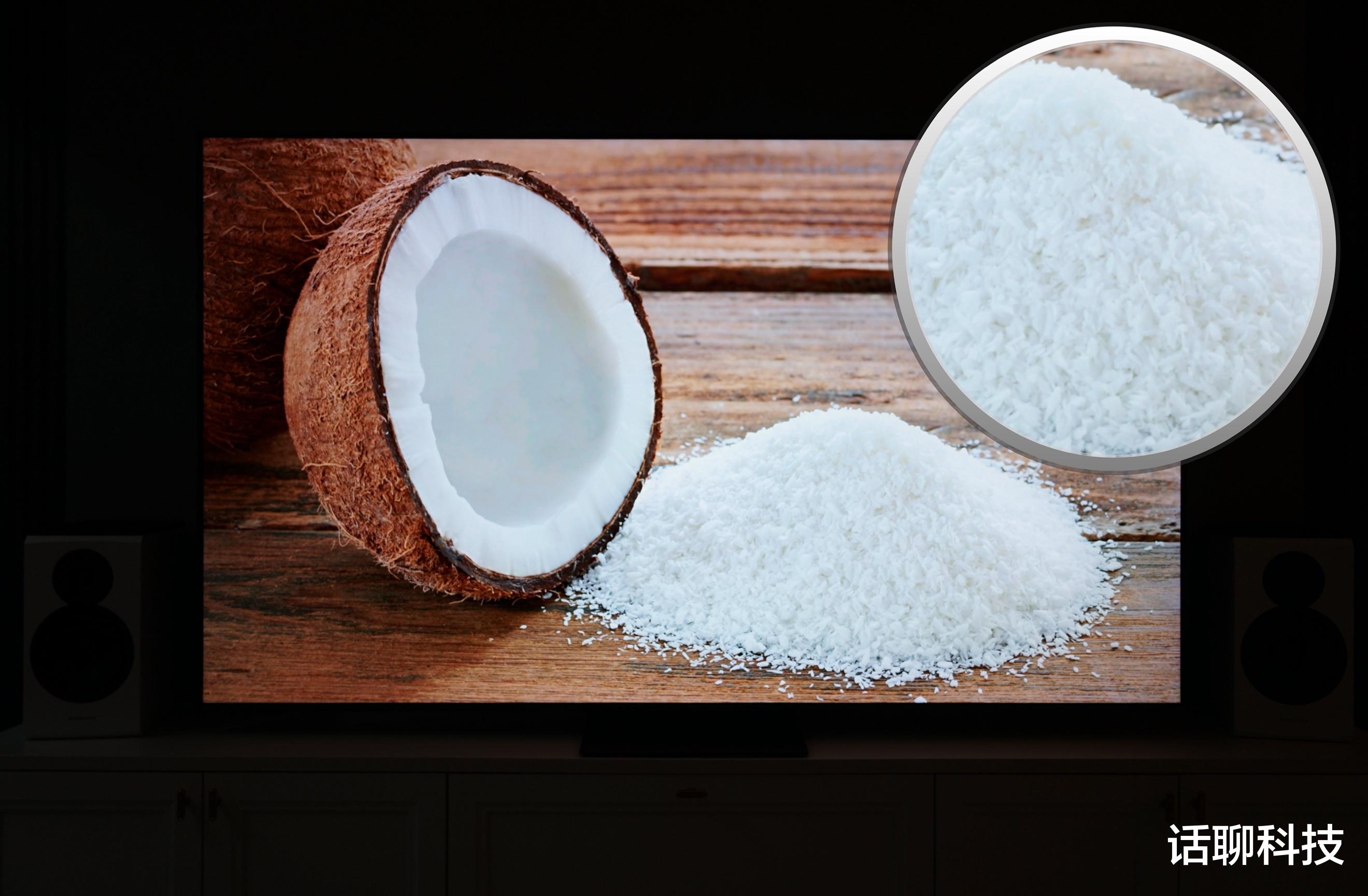 还有就是在呈现椰果白色果肉碎屑中,棕色的外壳,白色的果肉,以及堆放的碎颗粒,都能呈现的既有质感,也有细节,如果是峰值亮度不够高、控光细节不够好的普通Mini-LED电视是无法呈现这些效果的。