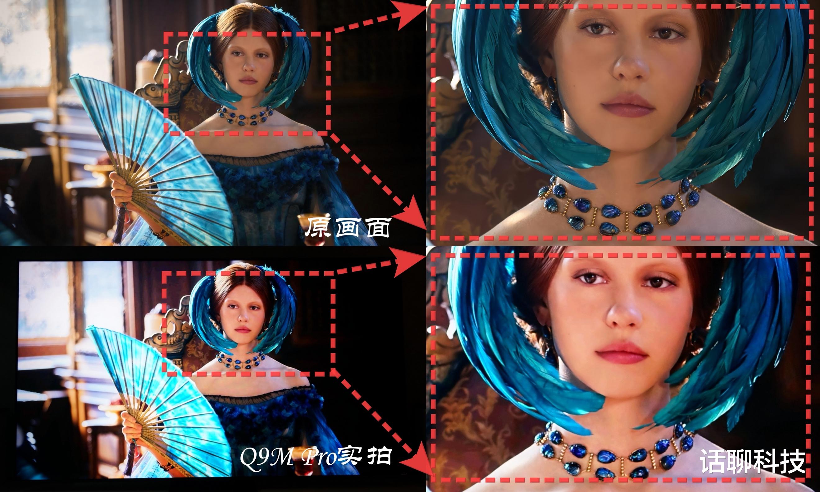 另外在人像表现上,超高峰亮、全局高色域与AI光色同控,也能让画面更讨好我们的眼球。下图是原画面与实拍画面的对比,可以看到人脸面部的肤色、明暗对比、头饰的蓝色羽毛的透亮感以及脖子上蓝宝石的闪金金,都是电视呈现的画面实拍图要更好看。