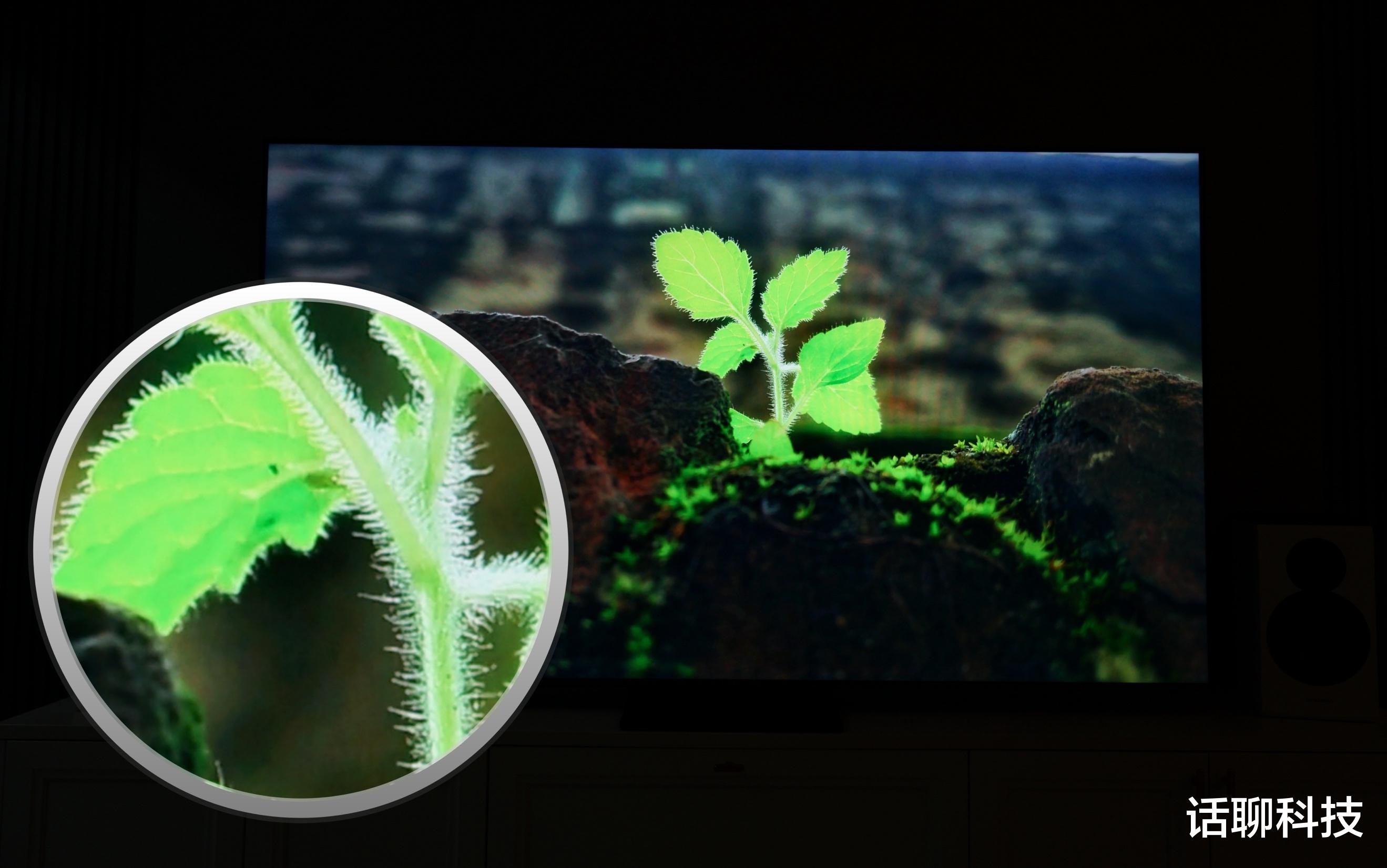 而从细节呈现来说,SQD-Mini LED技术也更为成熟,比如传统LED电视常见的光晕问题、RGB-Mini LED容易出现的串色的问题,在TCL 85Q9M Pro上表现的都不明显。比如显示下图这种刚刚长出嫩叶的野花野草的实拍画面,局部放大之后植被茎叶上的细毛都一根一根分离得清晰可见。