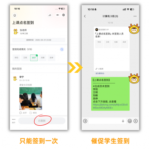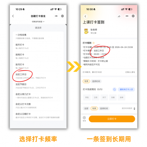 对于早晚自习、每周固定课这种需要长期签到的场景,直接用“打卡功能”就行。设置好签到频率(如每周三早10点、每天晚上8点晚自习),学生可以在同一条接龙里长期打卡,到点才能签。班委也不用天天发布新签到了,省事省心~