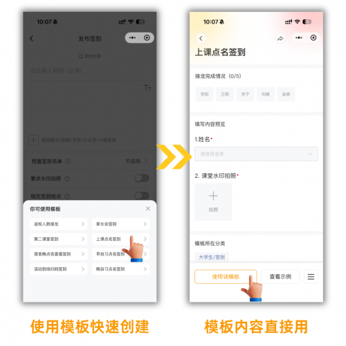 接龙管家内置丰富的课堂签到模板,简单修改即可生成签到链接,整个过程不超过30秒。将链接转发到班级群中,或二维码投屏到教室,学生点击链接或扫码即可完成签到,全程不到10秒,完全不占用课堂时间。