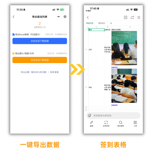 名单、时间、照片、定位等所有签到数据,都可以一键导出为Excel表格或压缩包。表格里姓名、时间、地点整整齐齐,照片文件自动按学生姓名命名,和签到信息一一对应。班委直接转发给辅导员或学校,学期末统计考勤再也不用熬夜了,节省90%的整理时间。