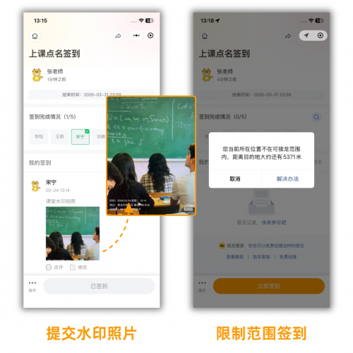 水印拍照签到:学生拍摄课堂照片,照片自动添加不可篡改的时间、地点、经纬度水印,真实还原现场