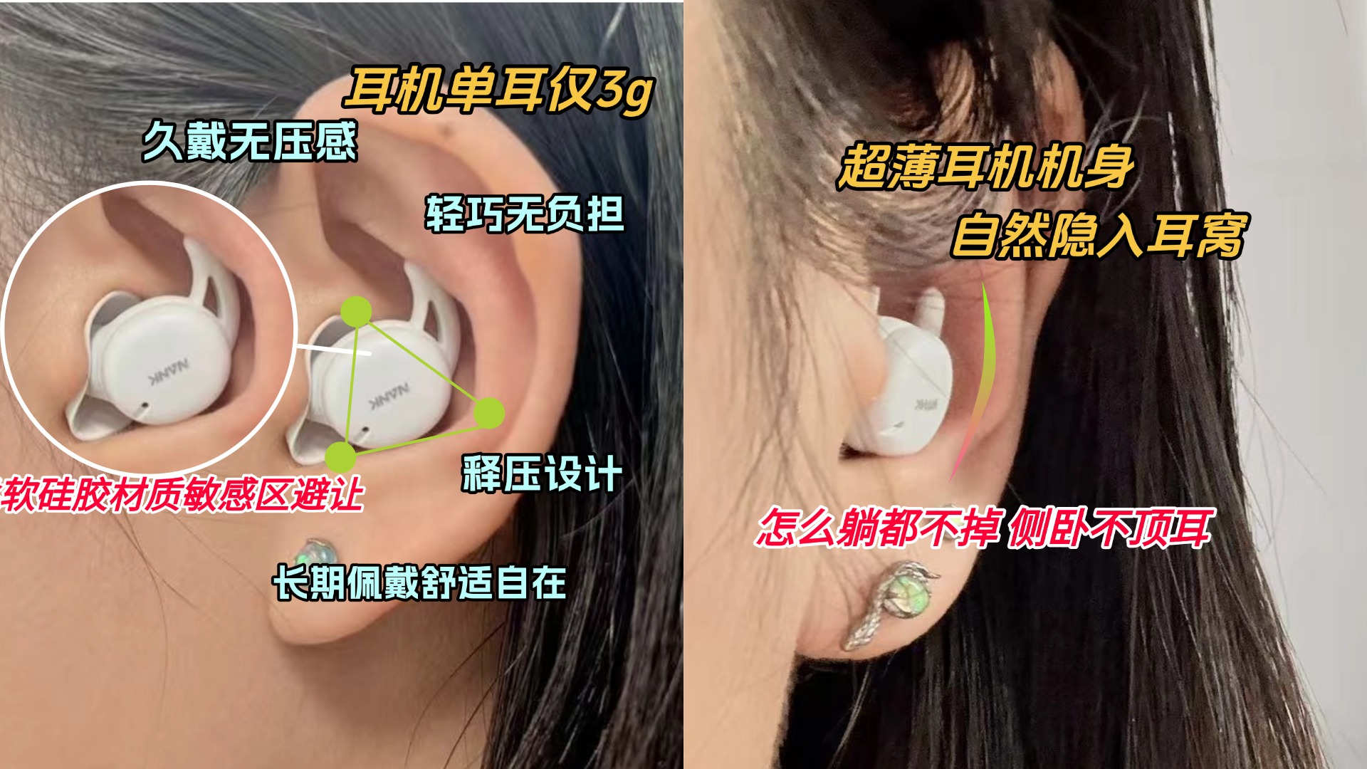 为追求整夜深眠的极致佩戴体验,南卡坚决砍掉不必要的冗余功能,8年专注深耕睡眠佩戴工学,率先采用行业首创的4mm超薄睡眠声学模组,搭配3g轻量机身,把佩戴压迫感控制在最低水平。ZPP三点力学分散技术与NanoSoft舒肤涂层的加持,佩戴舒适且稳固,侧睡无胀痛、趴睡无压迫、平躺贴合不脱落,完美适配各类睡姿,深受睡眠专家与测评师的青睐推崇。