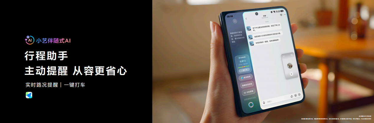 这些出行痛点,小艺伴随式AI可以做到“预判你的需求,提前为你做好准备”。出行前,小艺通过联动高德地图、滴滴出行等生态应用,结合你的行程和实时路况,提前推送最佳出发时间和行程规划,助你避开拥堵。等你飞机落地、高铁到站,滴滴出行的卡片会自动弹出,点一下就能一键打车,不用手动找APP、输地址,省去所有繁琐操作。你只管优雅赶路,剩下的杂活全交给小艺。
