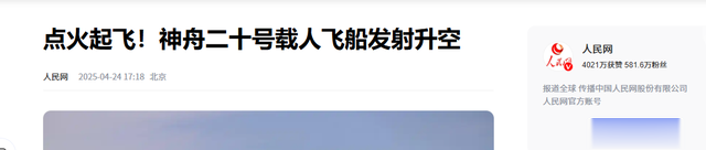 ( 信息来源:人民网 2025年04月24日 —— 点火起飞!神舟二十号载人飞船发射升空 )